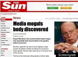The Sun's website url http://www.thesun.co.uk redirects to a false story claiming the paper's owner, News Corp chief Rupert Murdoch, is dead or to the twitter feed of hackers Lulzsec, which is tweeting what it says to be the username and passwords of News International staff, including former chief executive Rebekah Brooks.