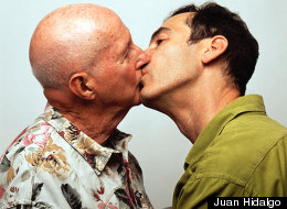A gay couple kisses as Pope Benedict XVI (R) waves to faithful from his popemobile on his way to Cibeles square in Madrid, on Aug. 18, 2011, before a welcoming ceremony.