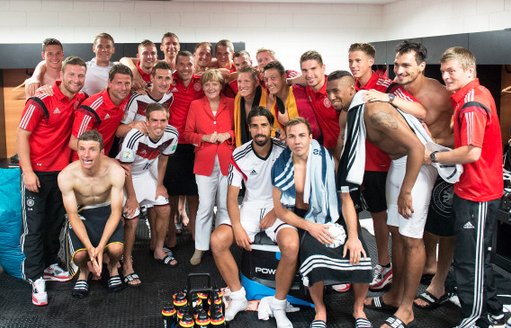Germany's World Cup squad received a visit from chancellor Angela Markel after she roared her compatriots on during their 4-0 thumping of Portugal. She even posed for a selfie with Forward player Lukas Podolski!