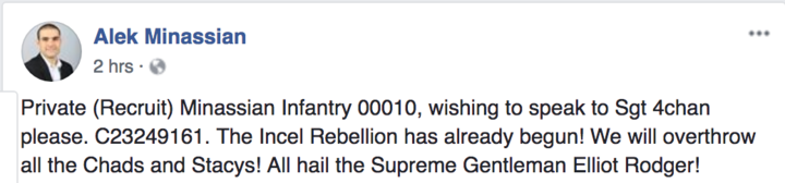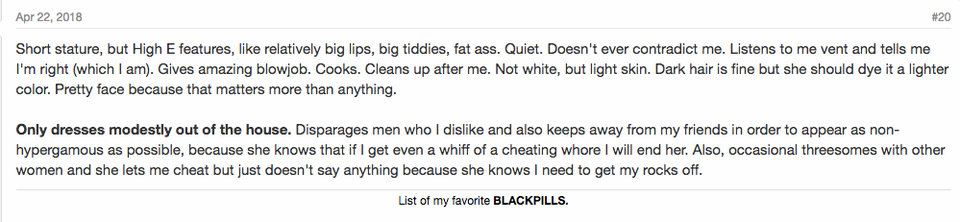 “Women and society have dejected us into loneliness and depression. Their obsession with looks has driven many of us who don’t fit their standards to anger and homicidal tendencies. This is not the result of mental illness, it is a normal response to prejudiced behavior,” one member wrote in April. “What’s the incentive for incels (ugly men) to follow YOUR social rules, when our actions, good or bad, will never be rewarded?” he asked. “Why NOT shoot up that sorority full of girls that teased you?”